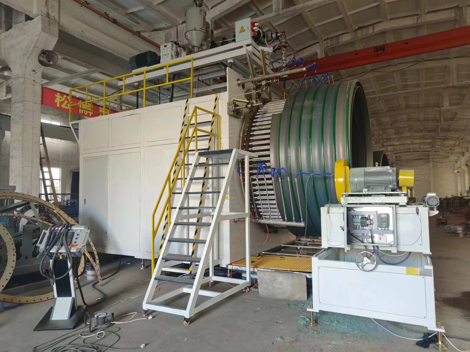 После надлежащей пластификации сырье направляется к комбинированной головке. Здесь система совместной подачи двух машин работает в тандеме со спирально-вращательным формующим механизмом. Комбинированная головка точно контролирует поток и распределение расплавленных материалов, позволяя навивать их вокруг оправки по спирали. По мере навивки материалы постепенно формируют полую стенку трубы. Непрерывное вращение оправки и согласованное движение экструдеров обеспечивают формирование трубы с постоянной толщиной стенки и равномерной плотностью по всей длине.